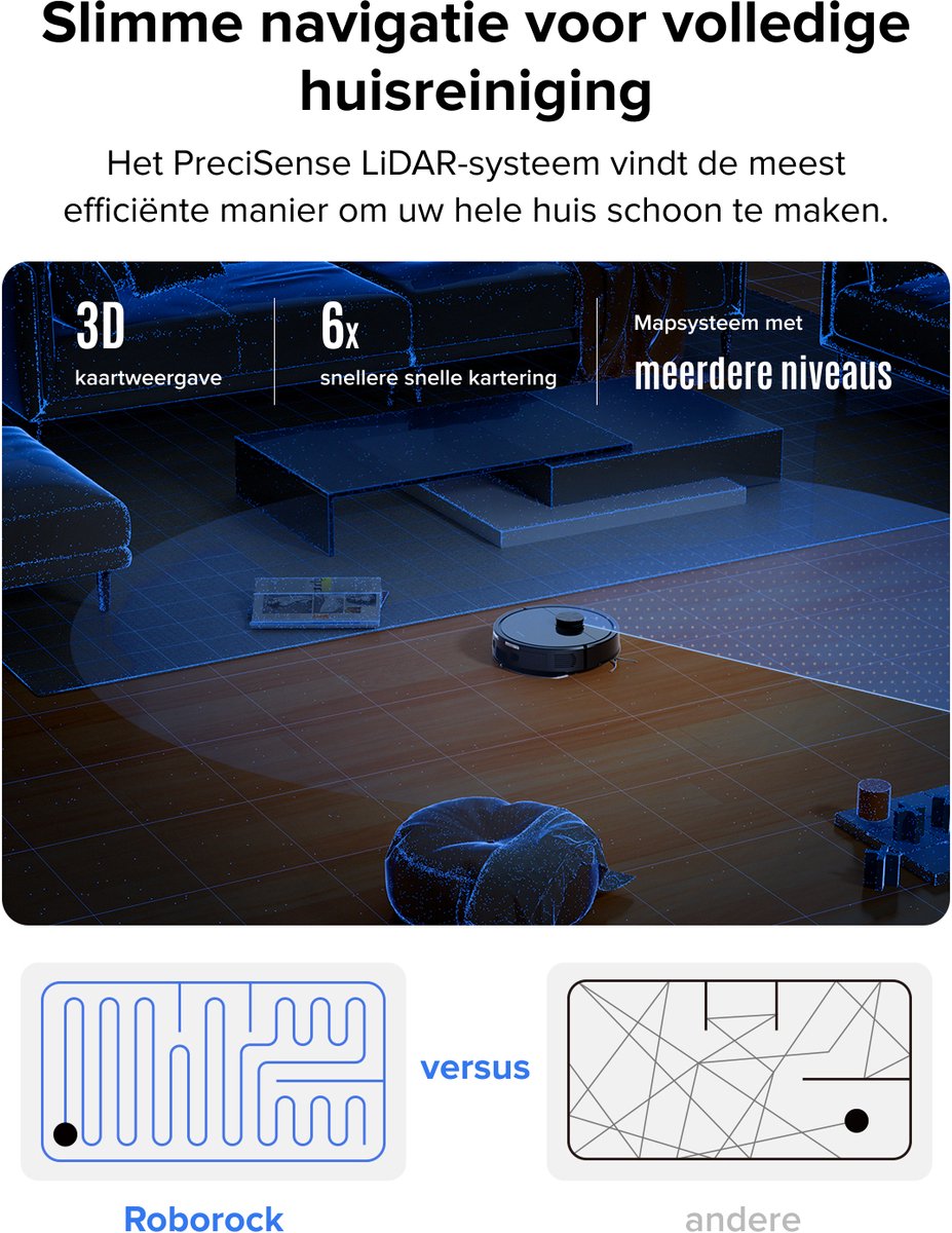 - Precieze LiDAR-technologie: 360° laserscanning maakt real-time kaartjes van je woning, plant de meest efficiënte schoonmaakroute en onthoudt meerdere plattegronden voor optimaal gebruik.