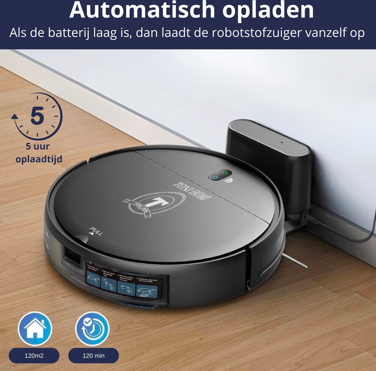 - Hoe lang blijft de batterij goed? De batterij gaat ongeveer 120 minuten mee en kan 240 m² schoonmaken—perfect voor grote huizen.