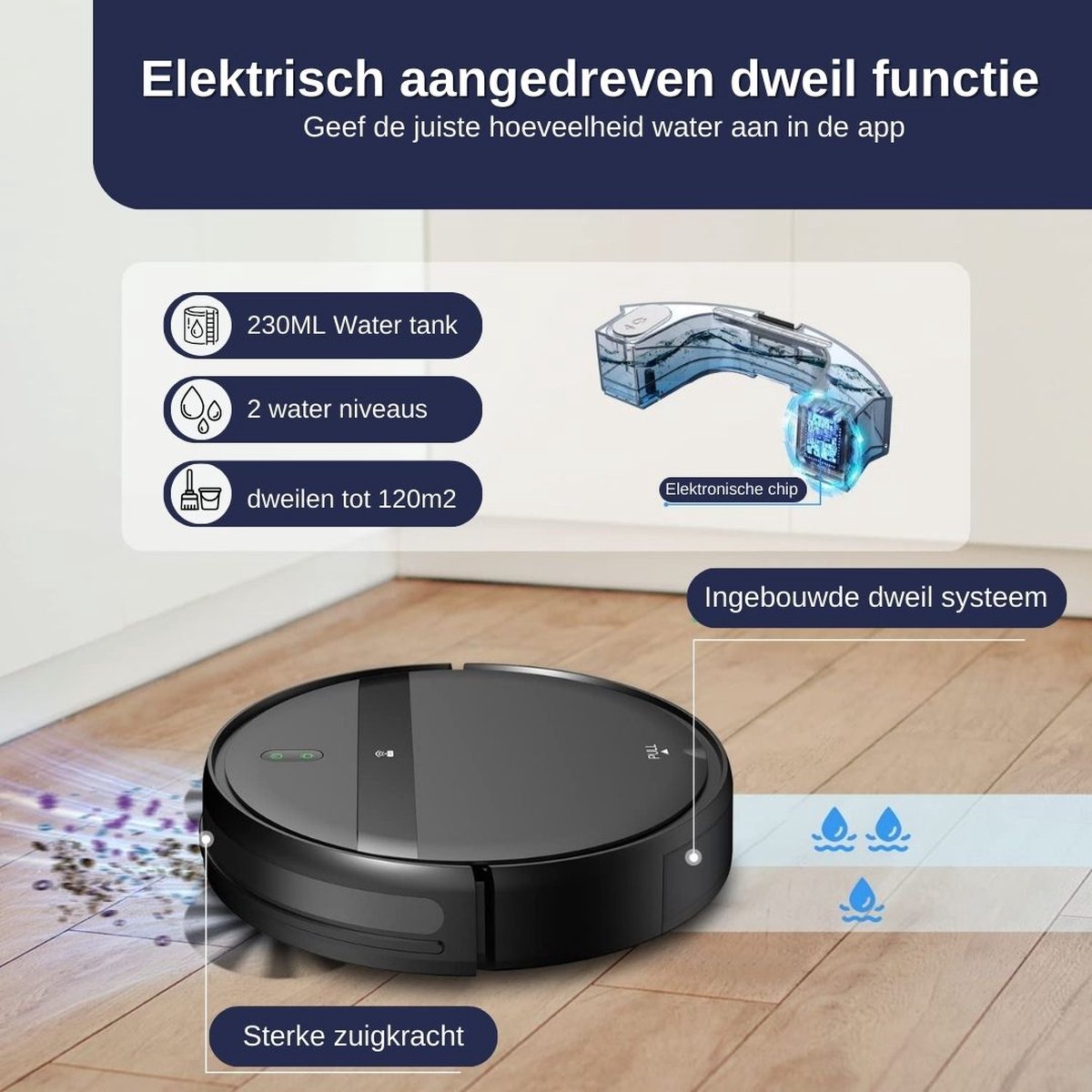 - Kan ik het dweilwater instellen? Ja, je kunt de waterhoeveelheid regelen via de app voor de perfecte vochtigheid.