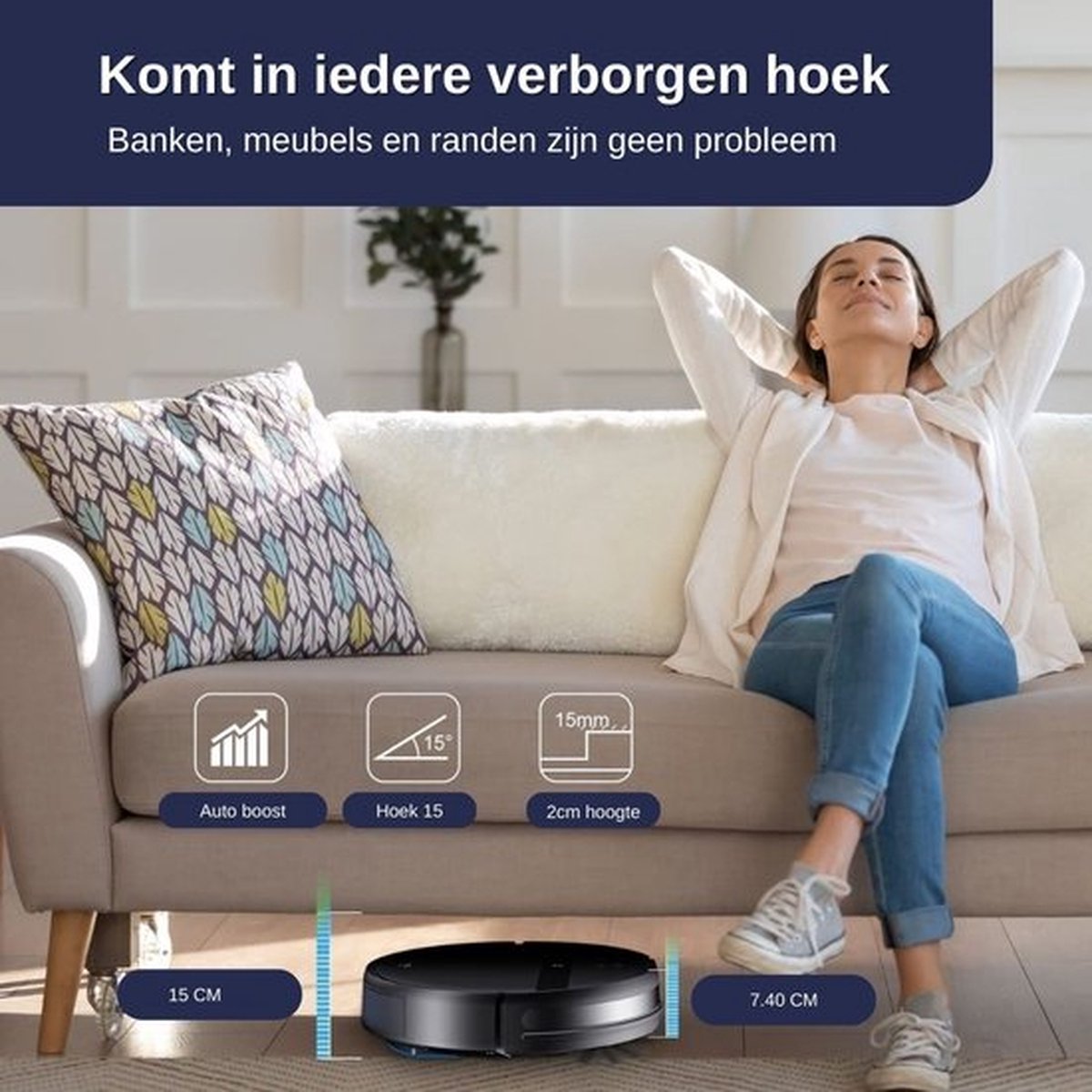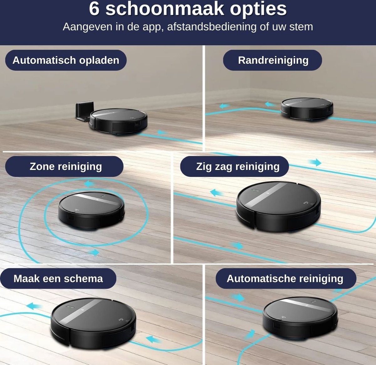 - Flexibel: klimt moeiteloos over lage obstakels (tot 2 cm) en beweegt efficiënt door alle kamers